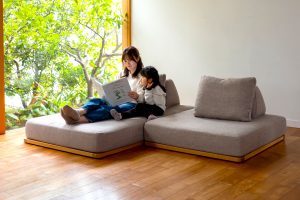 家族みんながそれぞれの場所でくつろげる「幸せになるソファ」も、付属のロータイプ脚に付け変えて、