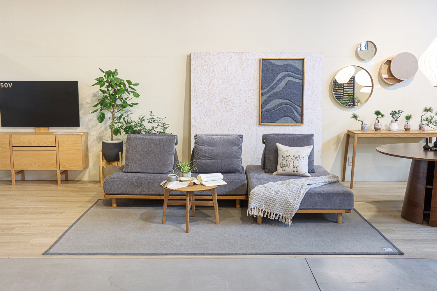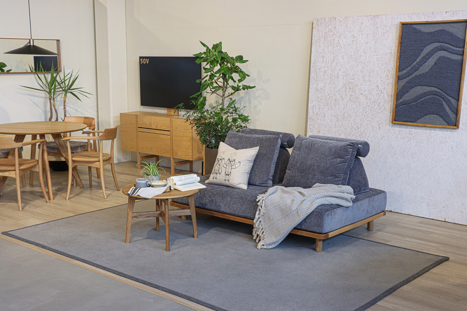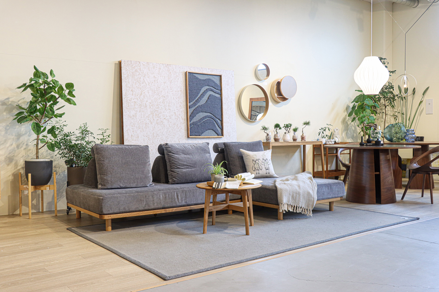Fumiのソファは、その優しいフォルムと機能性が三島家具のセレクトと見事に調和。人気の「幸せになるソファ」や「無駄のないソファ」など、実際に座って、触れて、その心地よさを確かめることができます。