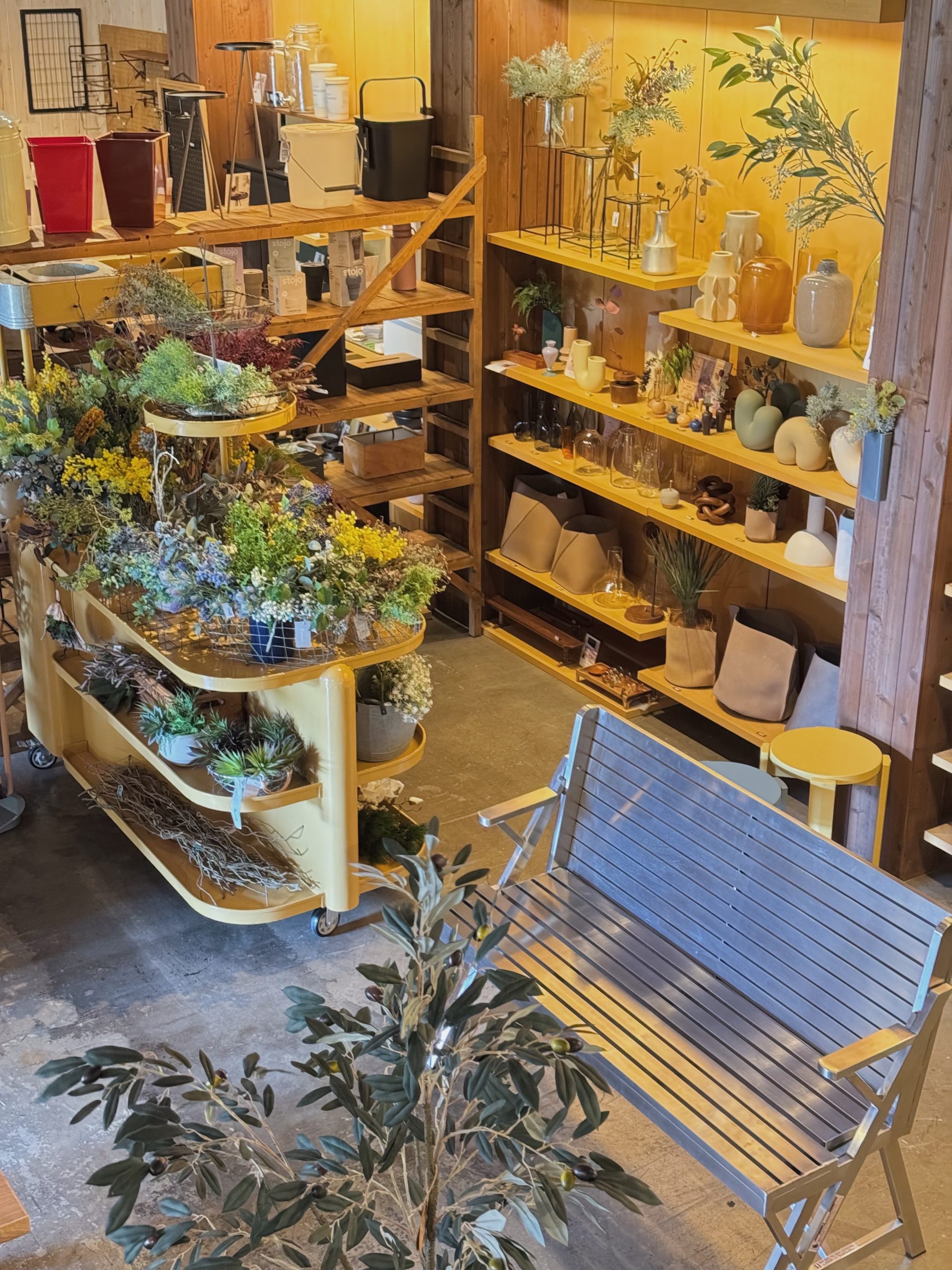 店内は、家具を中心とした「Interior」、ギフトや器が揃う「Shop」、お庭の提案をする「Exterior」のエリアに分かれています。 インテリアコーナーでは、Fumiのソファをはじめ、デザイン性と実用性を兼ね備えた家具を厳選。実際に座り心地や肌触りを確かめながら、自分の生活にどう馴染むかをじっくりと想像することができます。また、ソファに合わせたくなるラグや照明、フラワーベースなども充実しており、トータルでの空間づくりが楽しめます。